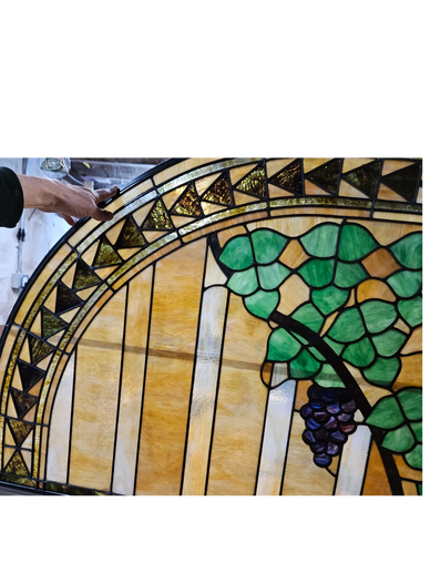 It’s easy to imagine this pair of windows hanging above the entrance of a chateau, or winery, greeting customers at the turn of the 1900’s. These windows are classic Art Nouveau in the Tiffany style, prominent between 1890-1910.