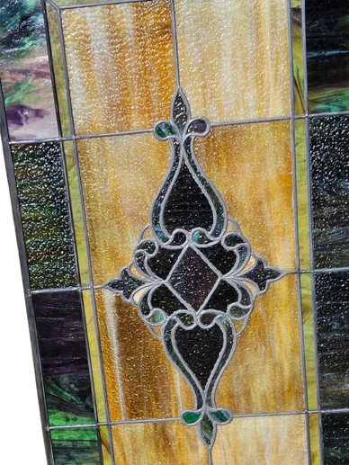 This stained glass window looks like a rockhound’s treasure — glowing with shades of green malachite, purple agate, golden citrine, and red jasper. Its Victorian-style design, textured glass and rich colors bring a calm, elegant warmth to any room.